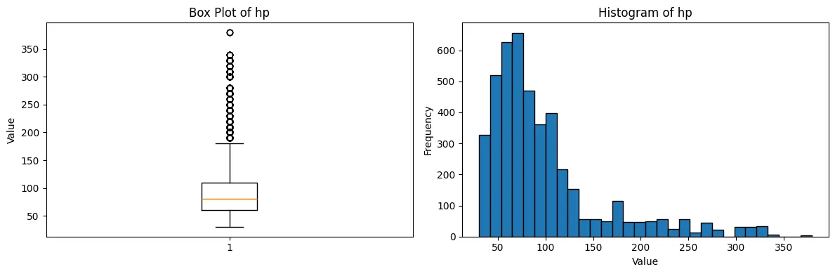 We can first take a look at the distribution of the target variable, HP. We can see that the distribution is right-skewed, with most cards having lower HP values and a few cards having very high HP values (outliers). Additionally, this is furhter highlighted by the box plot which shows several outliers above the upper whisker.