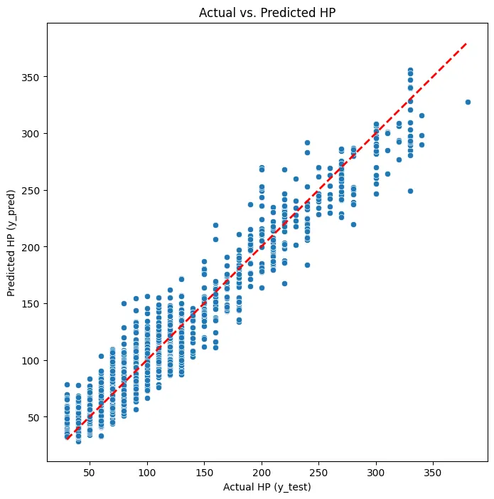 Evaluating the model’s performance on the test set, we achieved an R² score of 0.936 and an RMSE of 15.50. An R² score of 0.936 indicates that our model explains a significant portion of the variance in HP, which is quite good. The RMSE of 15.50 means that, on average, our predictions are off by about 15.5 HP points.